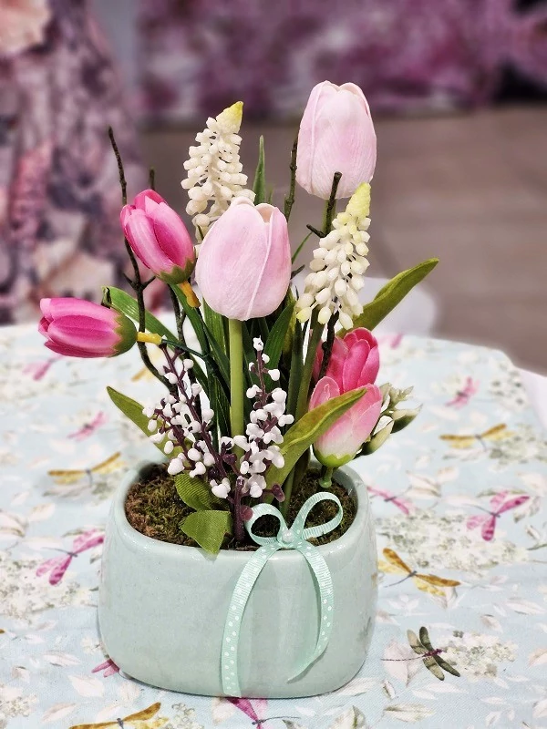 Menta kerámia kaspó díszítve prémium minőségű polifoam tulipánokkal, zöldekkel, tavaszi virágokkal. 11,5x26 cm