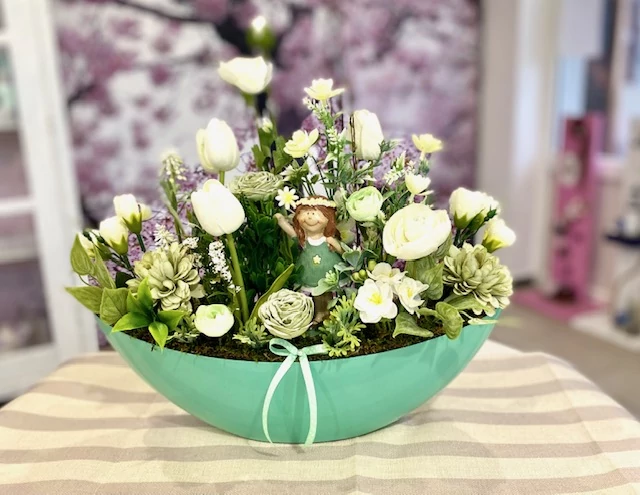 Menta csónakkaspó díszítve minőségi, élethű gumi tulipánokkal, zöldekkel, minőségi selyemvirágokkal, kerámia kislánnyal, masnival 40x14x37 cm