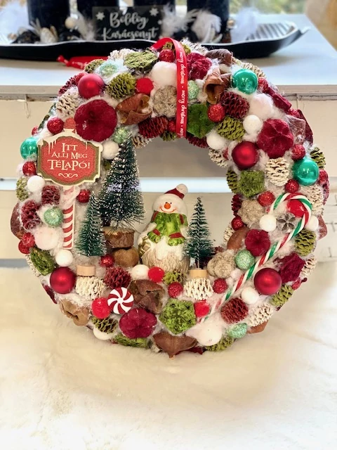 Szalma alap díszítve termésekkel, üveg gömbökkel, bogyókkal, kerámia figurával, fenyőfákkal, fa táblával, műanyag cukorka rúddal, led világítással, 32 cm