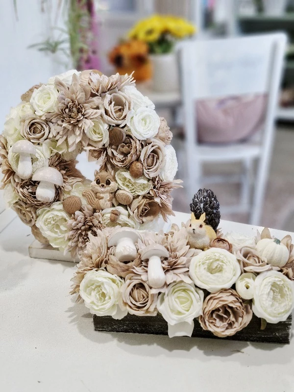 Barna fa láda díszítve minőségi selyemvirágokkal, gipsz gombákkal, mókussal, gipsz tökkel, 30x18x17 cm