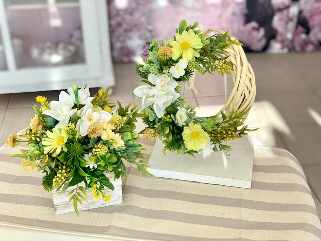 Sárga vessző alap díszítve minőségi selyemvirágokkal, zöldekkel, 25 cm