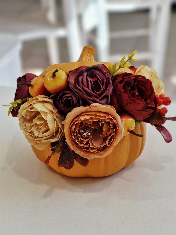 Narancs színű tök arany áthúzásokkal, díszítve minőségi selyemvirágokkal, őszi zöldekkel, vadalmákkal, 18x15 cm