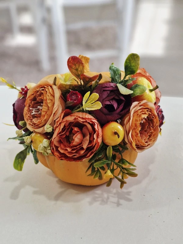 Narancs tök kaspó díszítve minőségi selyemvirágokkal, zöldekkel, almákkal, csipkebogyóval, 20x17 cm