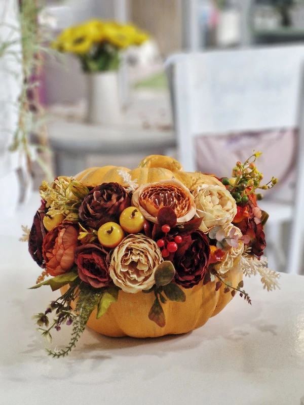 Tök kaspó díszítve minőségi, élethű selyemvirágokkal, zöldekkel, almákkal, csipkebogyóval, 29x20 cm