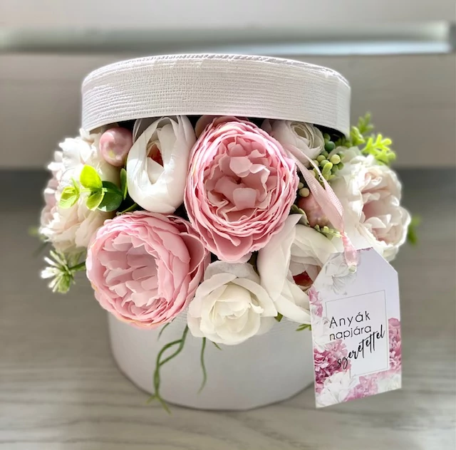 Fehér bordázott papírdoboz díszítve minőségi selyemvirágokkal, zöldekkel, Boldog anyák napját táblával. 20x18 cm