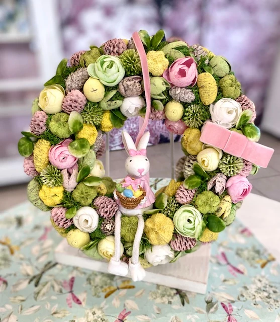 Szalma alap díszítve termésekkel, zöldekkel, kerámia nyuszi figurával, bársonymasnival, 29 cm