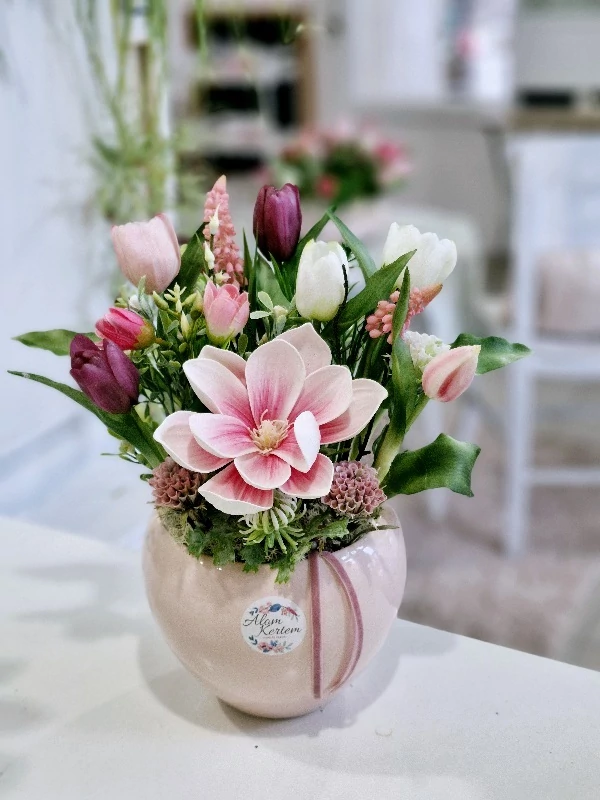 Rózsaszín kerámia kaspó díszítve élethű, prémium minőségű gumi tulipánokkal, magnóliával, zöldekkel, 28x34 cm