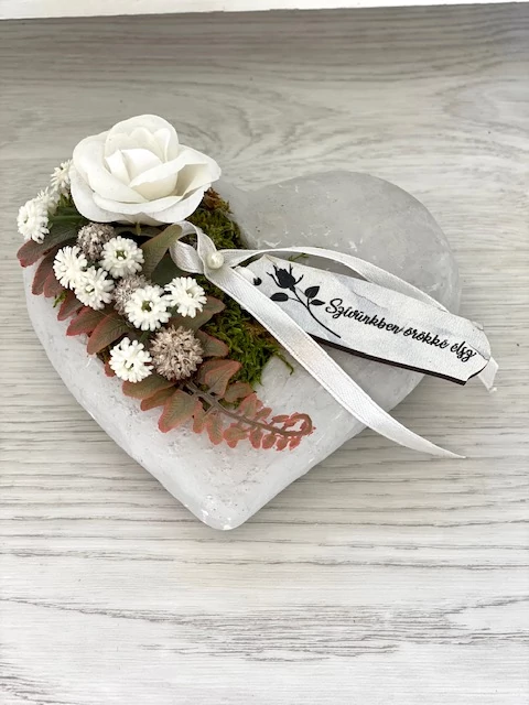 Gipsz szív ovális kivágással, díszítve selyem rózsával, termésekkel, masnival, szívünkben örökké élsz fa táblával. 15x13x7 cm