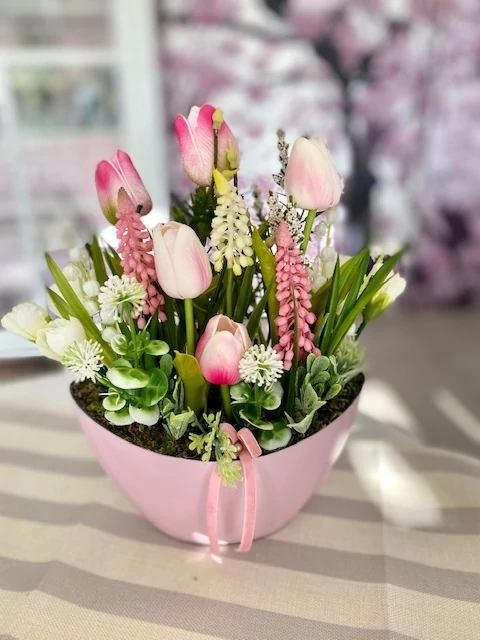 Rózsaszín csónakkaspó díszítve minőségi, élethű gumitulipánokkal, tavaszi virágokkal, zöldekkel, bársonymasnival, 23x10x28 cm