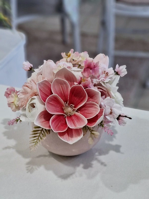 Rózsaszín kaspó díszítve minőségi, élethű magnóliával, selyemvirágokkal, 22x17 cm