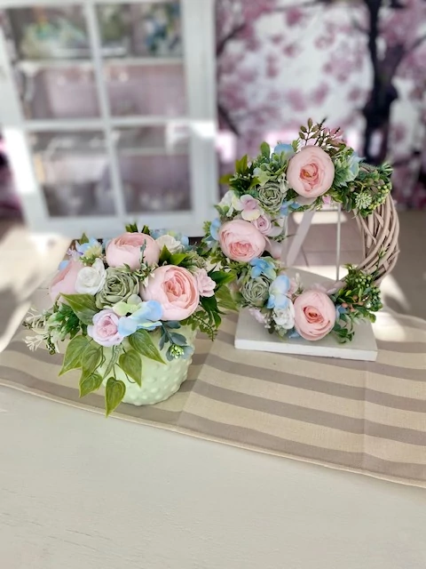 Rózsaszín vessző alap díszítve minőségi selyemvirágokkal, zöldekkel, 29 cm
