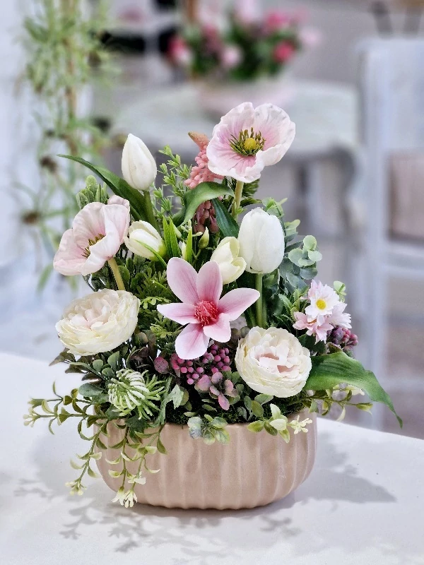 Rózsaszín kerámia tál díszítve élethű, minőségi prémium tulipánokkal, zöldekkel, tavaszi virágokkal, 26x14x32 cm