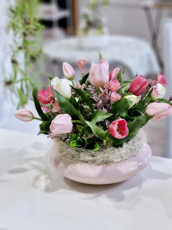Rózsaszín lapos kerámia kaspó díszítve, élethű, prémium minőségű gumi tulipánokkal, zöldekkel, 37x29 cm