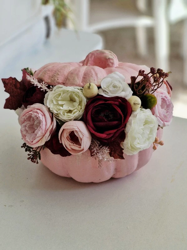 Rózsaszín tök arany áthúzásokkal, díszítve minőségi selyemvirágokkal, őszi zöldekkel, vadalmákkal, 26x19 cm