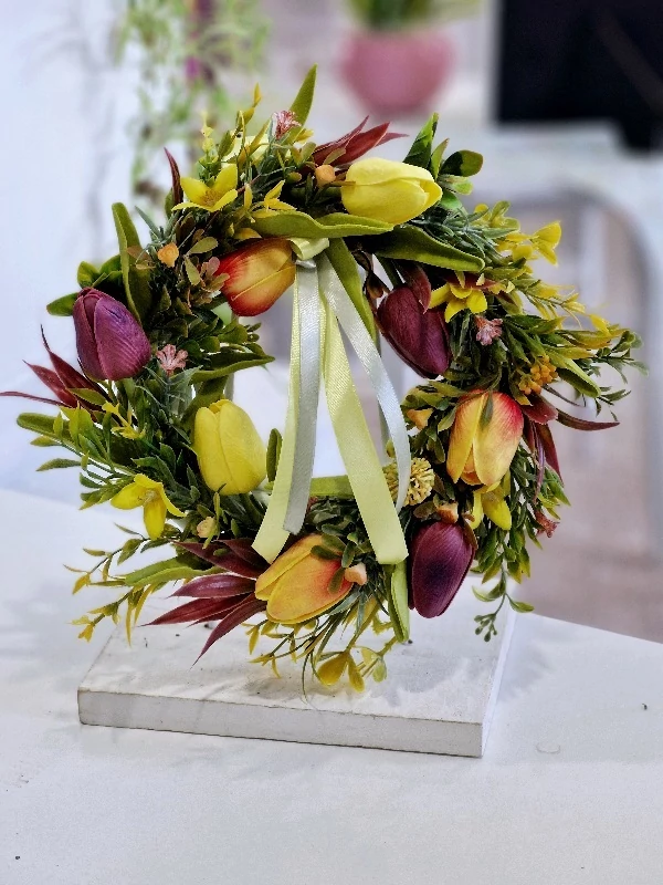 Zöld vessző alap díszítve minőségi, élethű polifoam tulipánokkal, zöldekkel, tavaszi virágokkal, 25 cm
