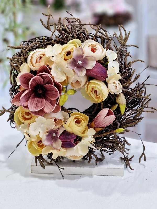 Vessző alap díszítve minőségi, élethű magnóliafejjel, selyemvirágokkal, 30 cm