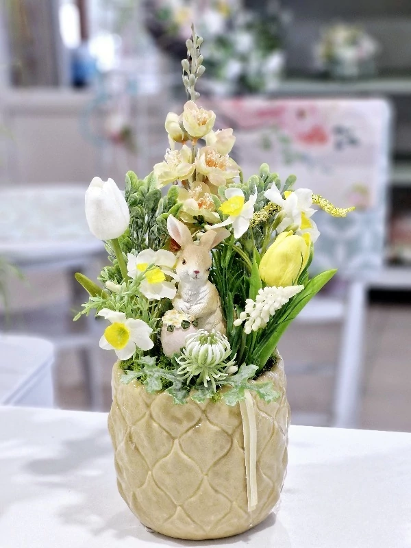 Sárga kerámiakaspó díszítve minőségi, polifoam tulipánokkal, tavaszi virágokkal, zöldekkel, nyuszi figurával, 19x40