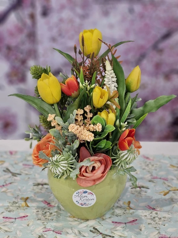 Zöld kerámia kaspó díszítve prémium minőségű gumi tulipánokkal, zöldekkel, tavaszi virágokkal. 23x32 cm
