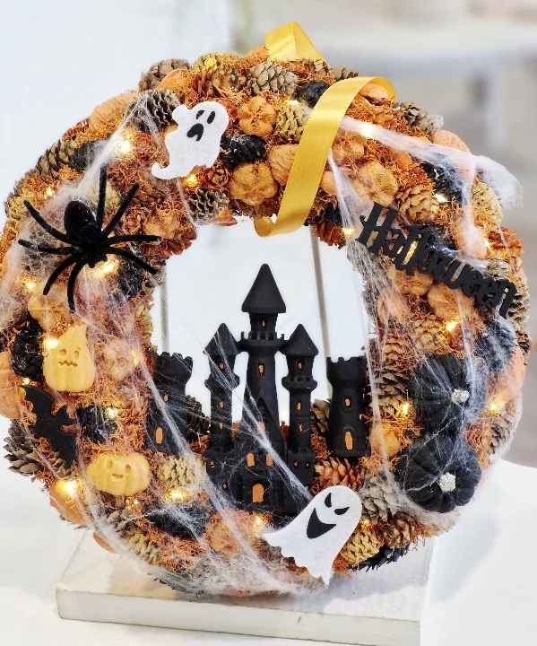Szalma alap díszítve termésekkel,gipsz kastéllyal, tökökkel, fa denevérekkel, szellemmel, pókhálóval, pókkal, led világítással, 30 cm