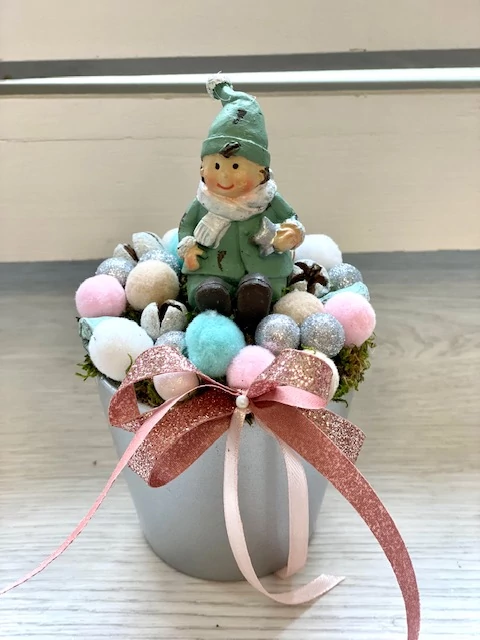 Ezüst kaspó díszítve színes termésekkel, bogyókkal, kerámia figurával. 10x16 cm