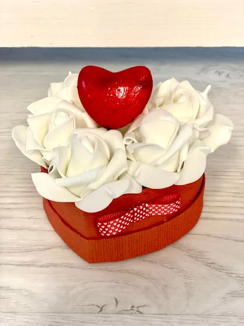 Papír szív formájú doboz díszítve minőségi polifoam rózsákkal, szivecskés masnival, szív beszúróssal. 13x11 cm