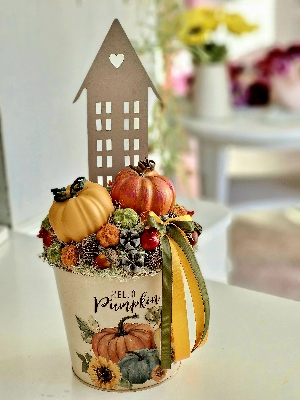 Tökös bádogkaspó díszítve gipsz tökökkel, termésekkel, makkal, vadalmákkal, 20x38 cm