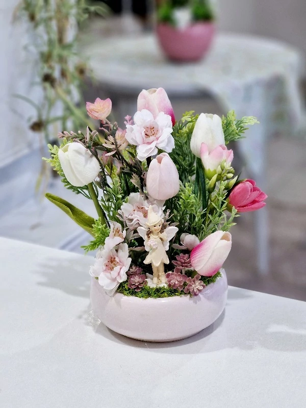 Rózsaszín kerámiatál díszítve minőségi, élethű tulipánokkal, zöldekkel, tavaszi virágokkal, tündérkével, 20x22 cm