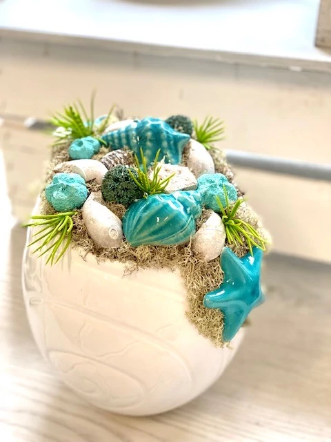 Fehér kerámia csiga díszítve türkiz kerámia kagylókkal, termésekkel, zölddel. 21x22 cm