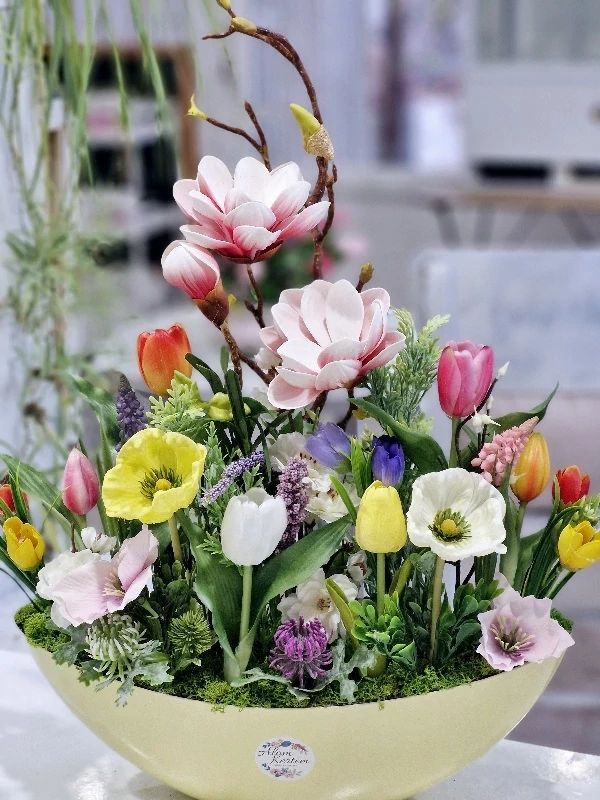 Citromsárga műanyag csónaktál díszítve élethű, minőségi prémium tulipánokkal, magnóliával, zöldekkel, tavaszi virágokkal, 40x16x55 cm
