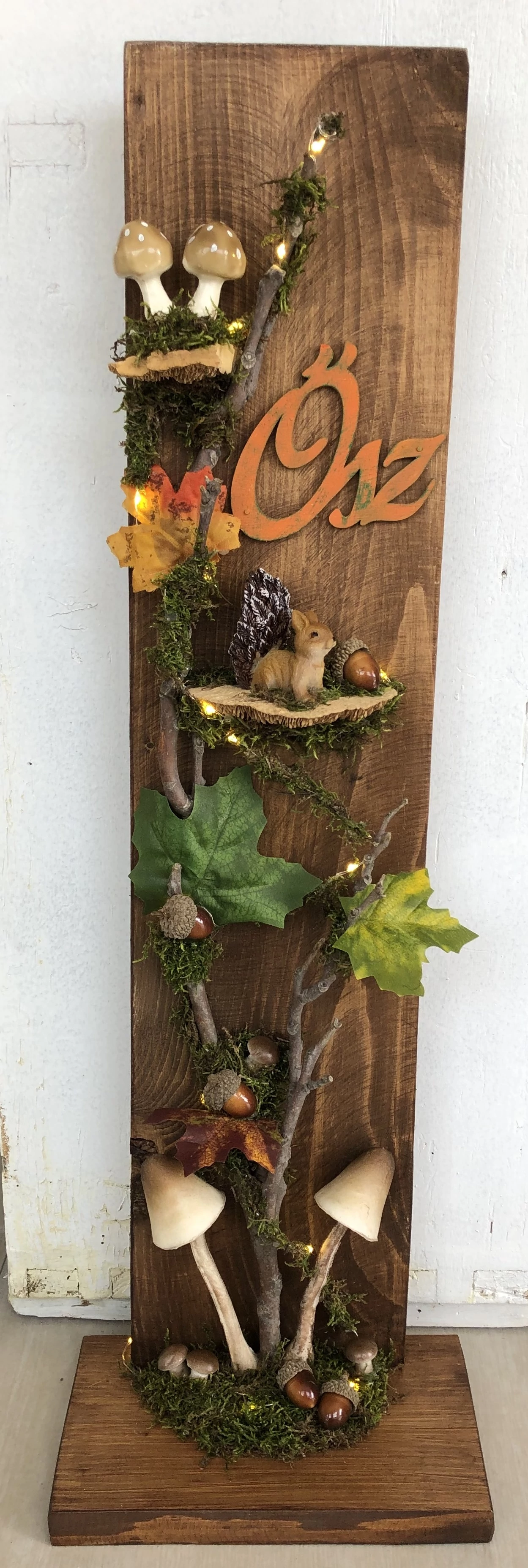 Tömör fából készült hazaváró állvány. Mogyoró színre festve, faágakkal, gombákkal, makkal, mókussal díszítve. Világítás is el van rejtve rajta. 20x63,5x12 cm. Egyedi megrendelést e-mailben, vagy facebookon lehet leadni.
