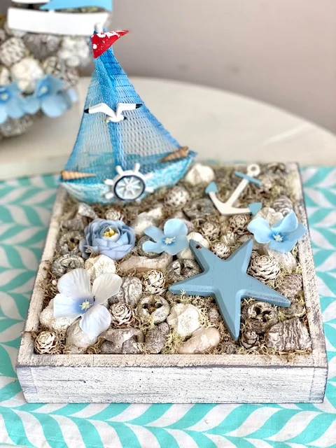 Fehér-szürke fa láda díszítve fehér termésekkel, világoskék selyemvirágokkal, vitorlással, fa csillaggal, horgonnyal. 20x20x28 cm